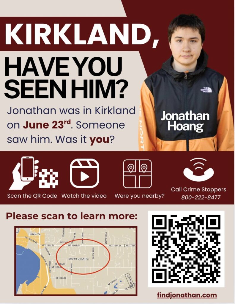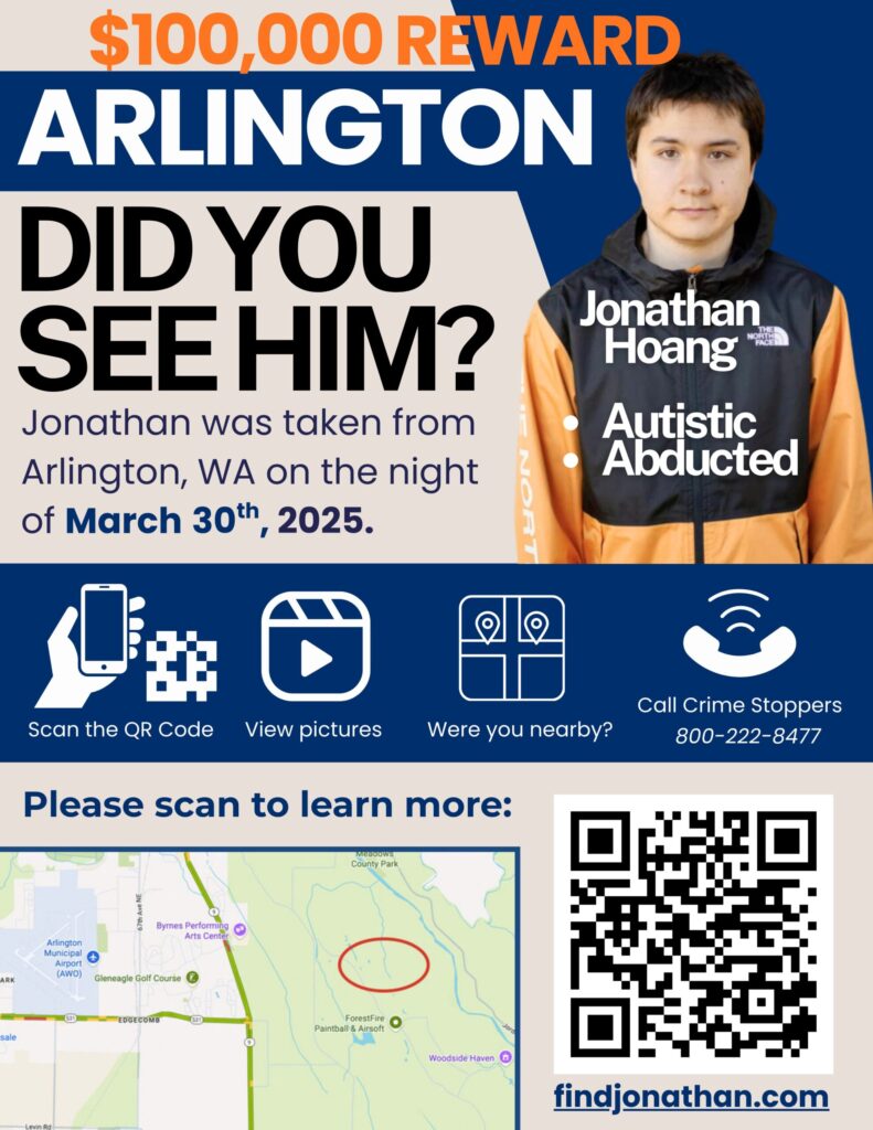 Jonathan Hoang is a sweet, 21-year-old with autism. He was taken from his home in Arlington, Washington on the night of March 30th. He was spotted on multiple home surveillance cameras around 11pm on June 23rd in Kirkland, Washington and has not been seen since. He needs your help to get home.
